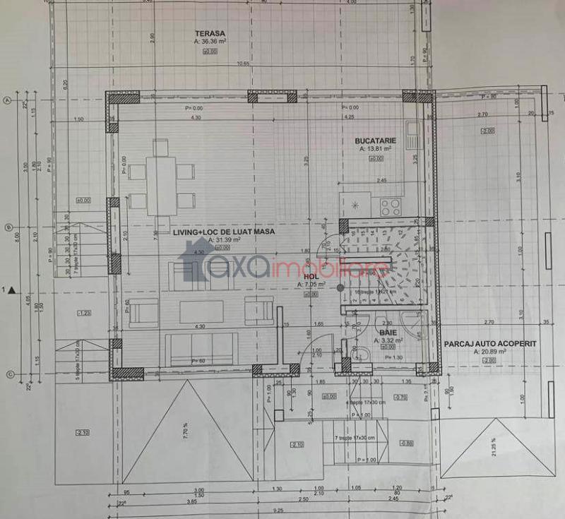 PARTER: 1 living cu 1 bucatarie de tip open space, 1 baie, 1 hol, casa scarii, 1 terasa, 1 loc de parcare (acoperit).