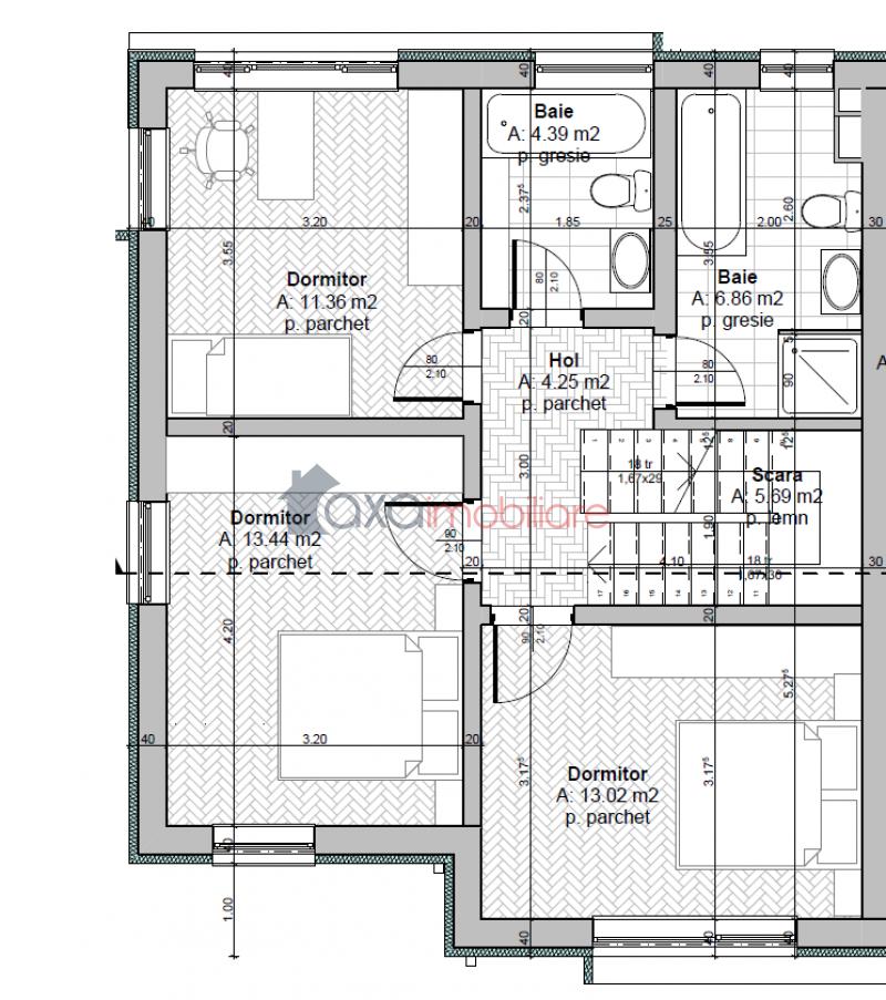 ETAJ / AL DOILEA NIVEL: 3 dormitoare, hol, 2 bai, casa scarii.