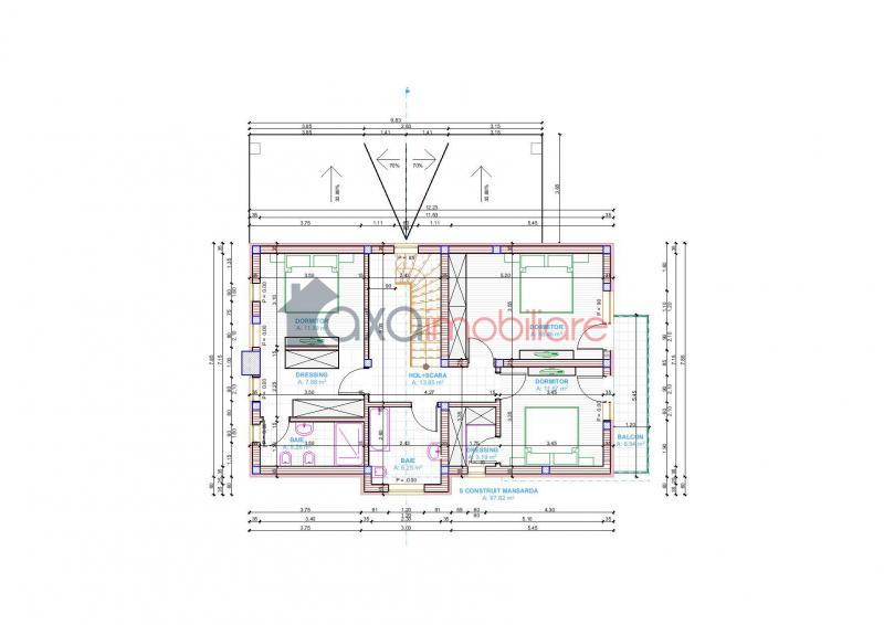 ETAJ: 2 dormitoare, 1 baie, hol, 1 dormitor matrimonial (cu baie proprie si dressing), balcon, casa scarii, hol.