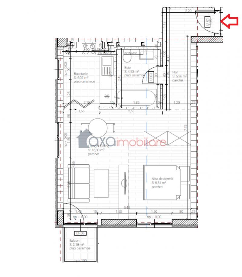 Compartimentare: 1 hol, 1 baie, 1 nisa de dormit, 1 living cu dining, 1 bucatarie + 1 balcon deschis.