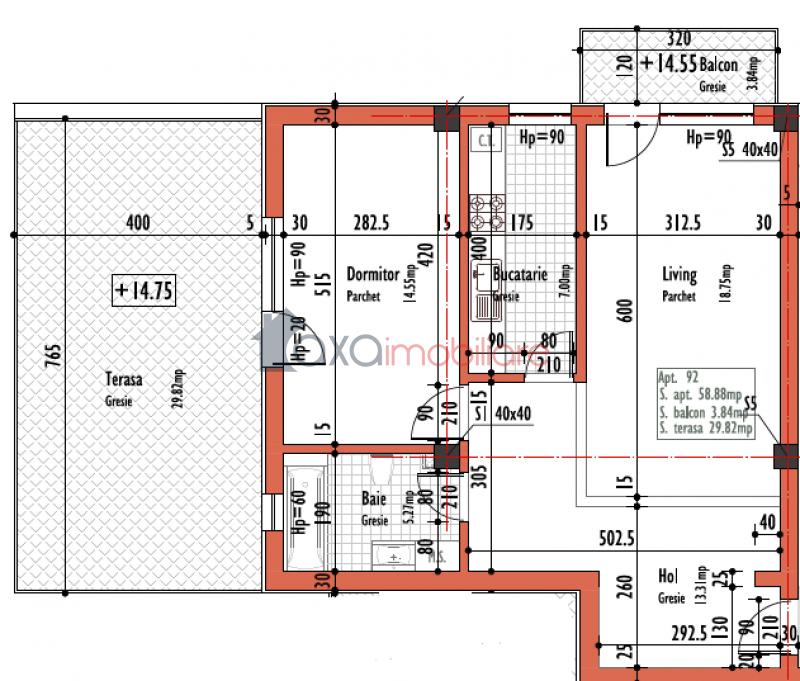 Este compus dintr-un living, 1 bucatarie, 1 hol, 1 baie, 1 balcon si 1 terasa.
